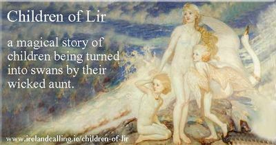 But Aoife’s spell had not taken away children’s voices, and so it was that these four beautiful swans could sing beautiful songs and were able to tell their father what had happened to them. Lir, who had been searching for his children, came down to the lake and saw Fionnuala, now a swan, who told him of spell cast on them by Aoife. Enraged, he banished Aoife into the mist, and she was never seen again.